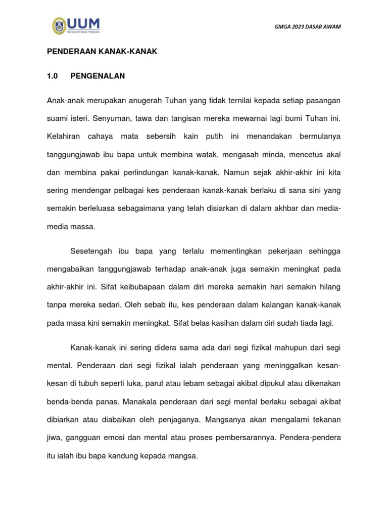 Karangan Langkah Mengatasi Masalah Penderaan kanak-kanak Mengutamakan agenda kasih sayang dalam keluarga Kesedaran dalam kalangan anggota keluarga Mendalami ilmu dan. Anak anak yang selalu ditekan akibat ibu bapa yang beremosi menyebabkan mereka kehilangan motivasi dan semangat untuk belajar walaupun mereka berpotensi untuk berjaya.